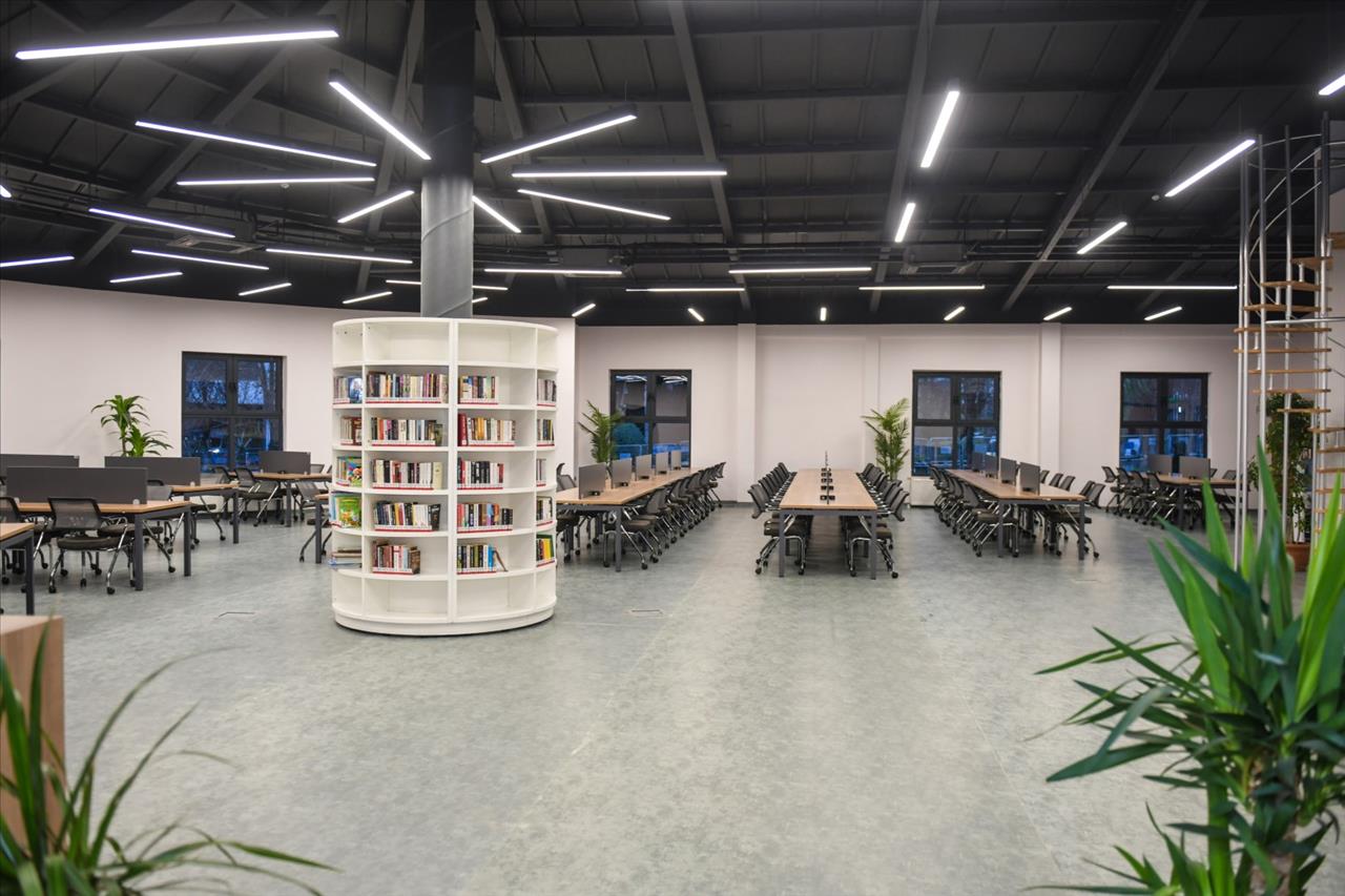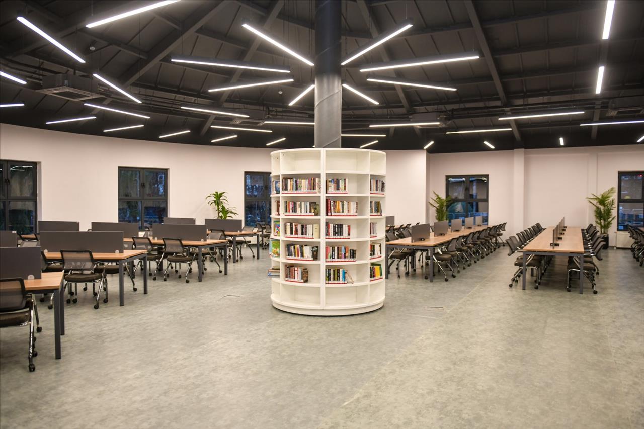 Modern mimarisiyle dikkat çeken kütüphane huzurlu bir ortama, geniş okuma alanlarına, konferans salonuna, mescide ve dinlenme alanlarına sahip.